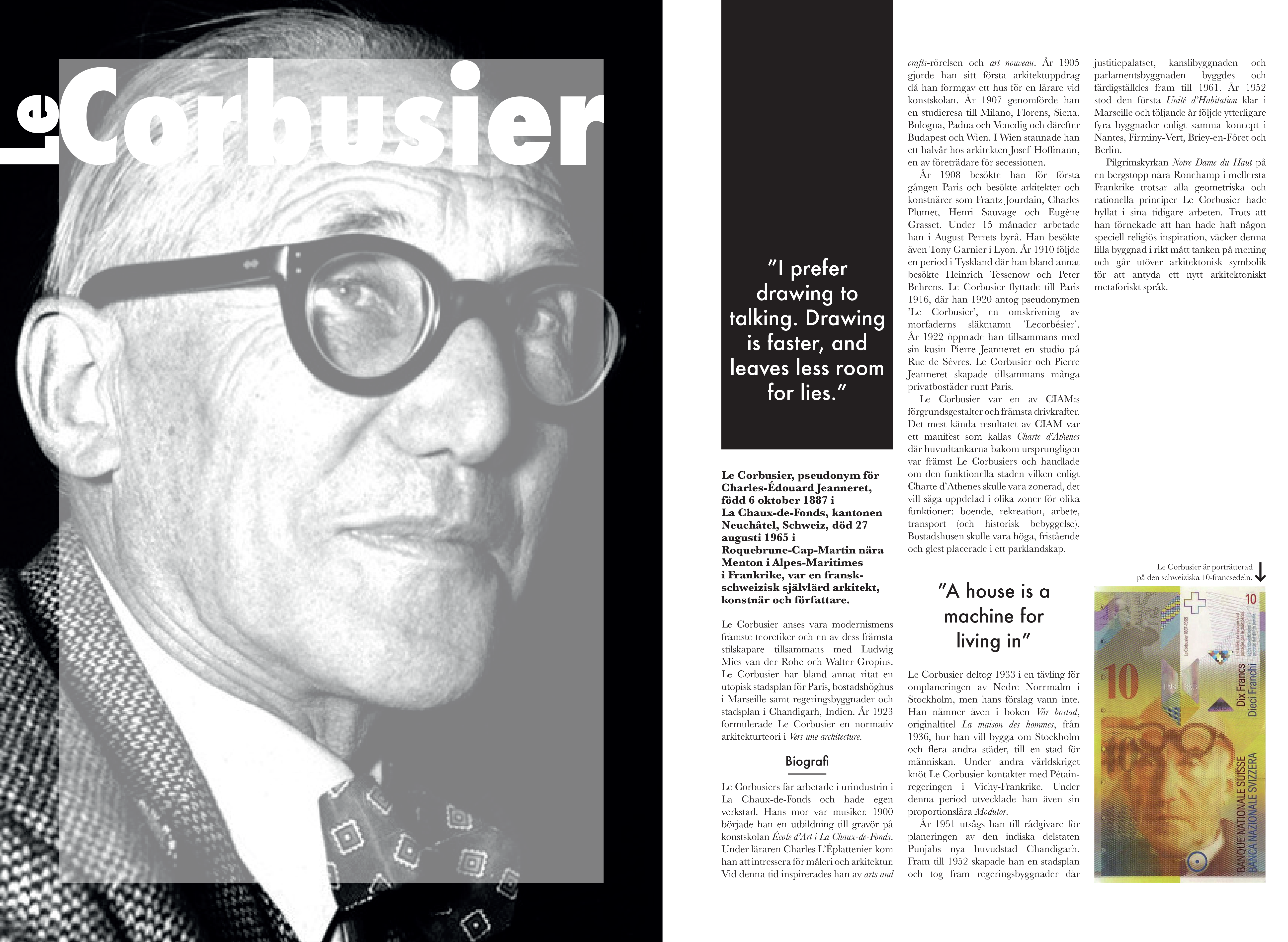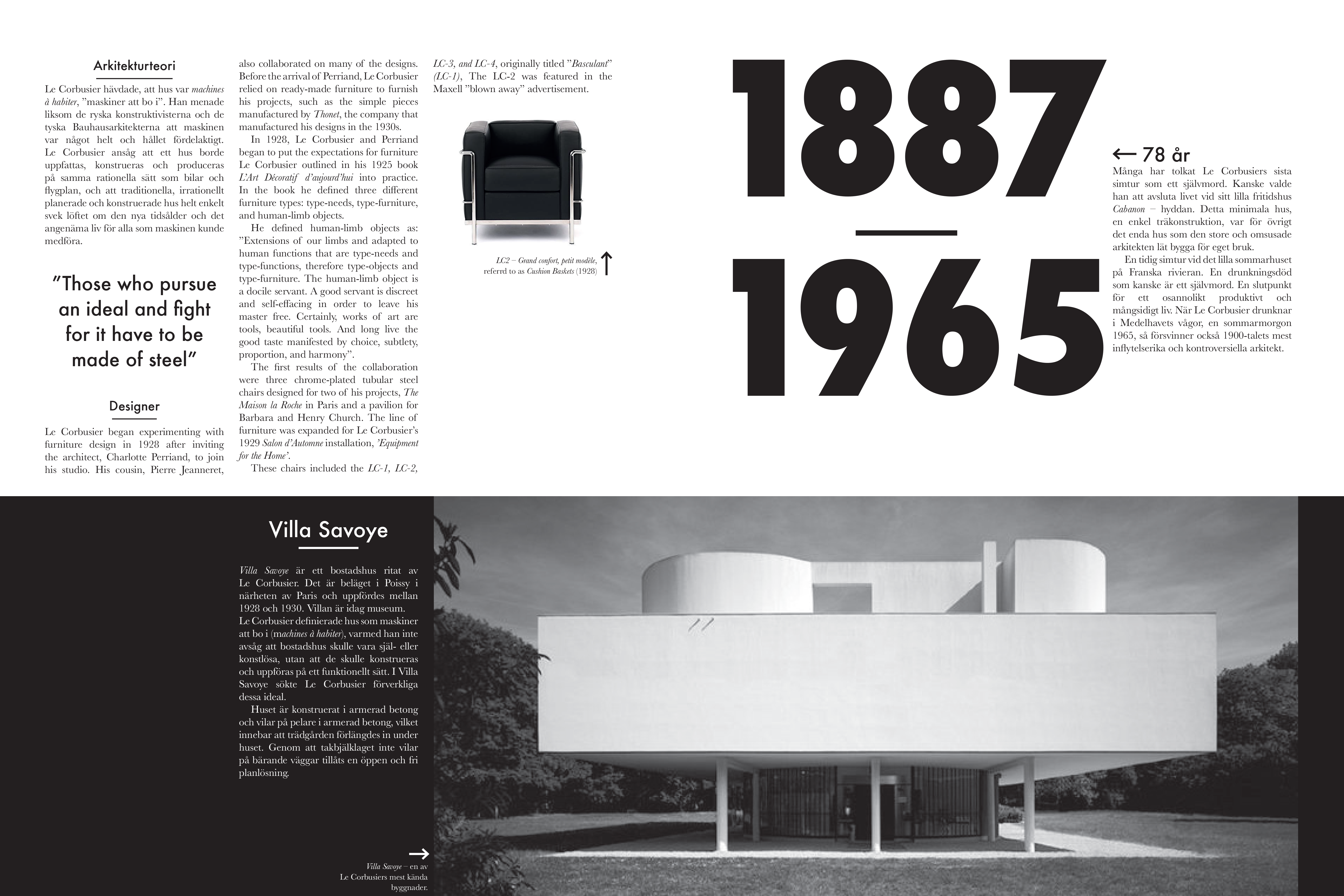 Del av tidskrift, trycksak. Tidskriften är tänkt att vara inriktad på arkitektur & design där det utformade uppslaget handlar om arkitekten Le Corbusier. Typografin med dess teckensnitt, layout och färger, är utvalda för att passa temat – modernistiskt och strukturerat med mycket kontraster som skapar dynamik. Sofistikerat men lekfullt.